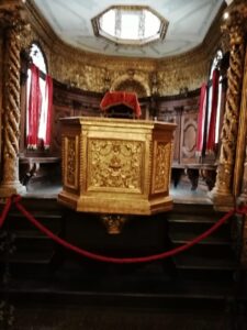 El interior tiene características barrocas; por ejemplo, el frontón del Arca se encuentra partido, esto es una característica del barroco: frontones curvos o frontones partidos. Hay inscripciones hebreas incrustadas en los escalones y en el interior de las puertas.