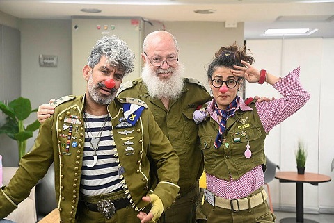 Lo primero que llama la atención al entrar en el espacio común lleno de sofás, rincones con actividades y refranes de refuerzo que adornan las paredes es un hombre y una mujer que caminan entre los pacientes, vestidos mitad como soldados de las FDI y mitad como payasos con narices rojas. “Se trata de la Fundación Kliger-Asor y David ´Dosh´ Brashi, una pareja de payasos médicos veteranos, con años de experiencia en hospitales con los casos más trágicos, tristes…inimaginables”.