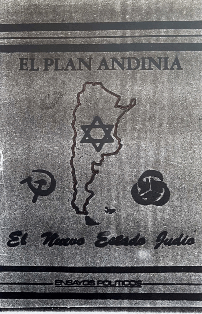 El primer folleto que se conoce está fechado en 1962, no tiene firma y se titula El Plan Andinia o El nuevo estado judío. Tiene 24 páginas y en ellas reproduce párrafos textuales tomados de Los Protocolos de los Sabios de Sion, un folleto de principios del siglo pasado cuya falsedad ha sido archidemostrada: es un plagio de una sátira de Maurice Joly, de 1864, llamada Diálogo en el Infierno entre Maquiavelo y Montesquieu. Aunque es conocido su carácter apócrifo, los Protocolos son todavía leídos y creídos por personas incautas.