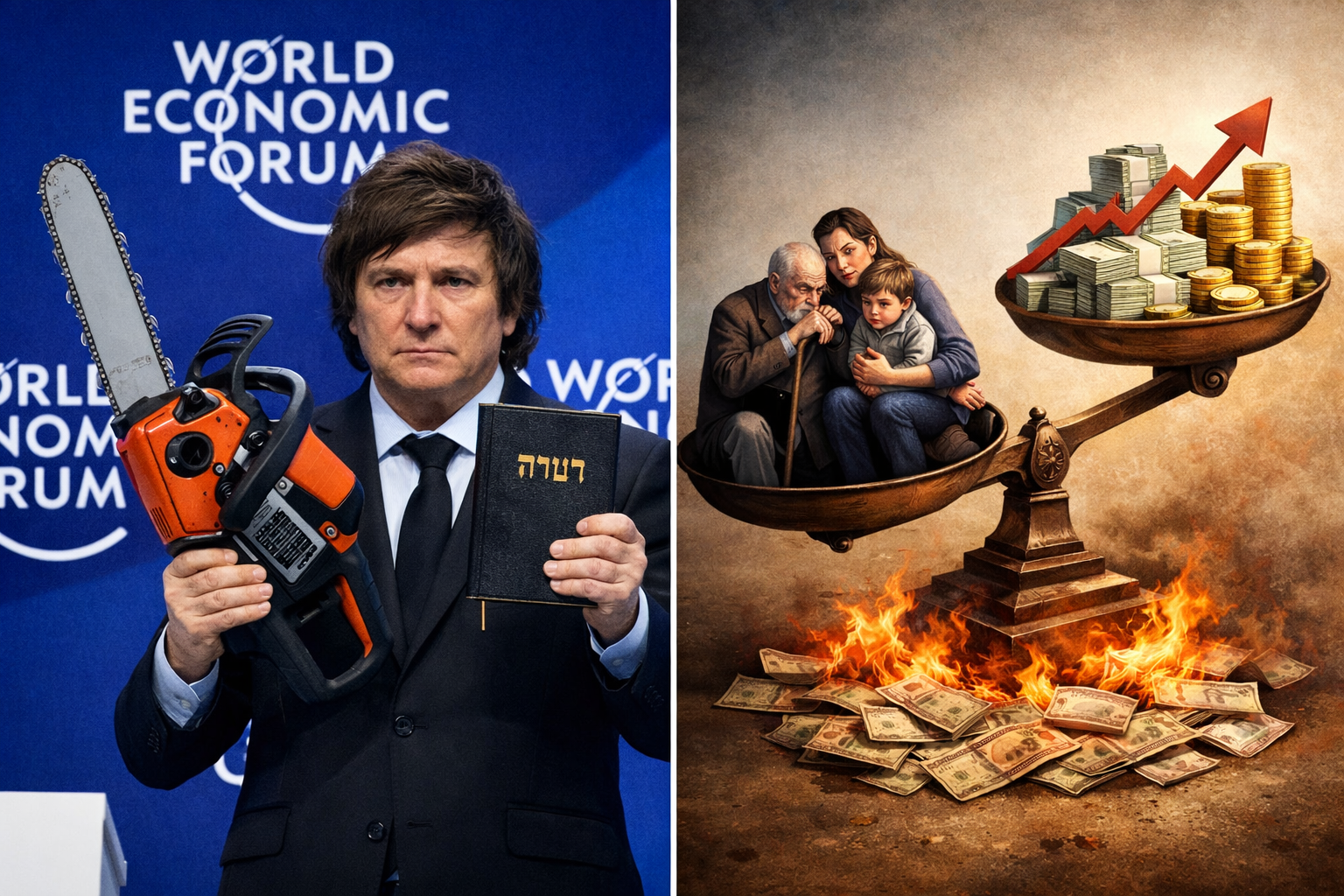 Segundo, porque Milei no se limita a una metáfora genérica: toma elementos del judaísmo y de la Torá para legitimar su programa. En un discurso público de 2025 (Fundación Faro), el propio presidente mencionó la Torá y a Moisés en su narrativa política. En Davos 2026, Milei llevó esta narrativa al extremo al citar la Parashá Bo, que describe el enfrentamiento de Moisés contra el Faraón. En su interpretación, el Faraón es el «símbolo del poder opresor del Estado». Al vincular las plagas de Egipto con las consecuencias de negar la libertad, Milei advierte que la hambruna y la oscuridad son el destino inevitable de las sociedades que abrazan el colectivismo. Esta hermenéutica ha sido calificada en este mismo medio como un «judaísmo grotesco» por Ignacio Rullansky, quien señala que el texto bíblico se utiliza de forma instrumental y revanchista, despojado de su contexto religioso para convertirse en una herramienta de lucha política.