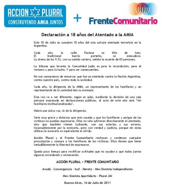 AMIA 18J – Declaración de Acción Plural y Frente Comunitario