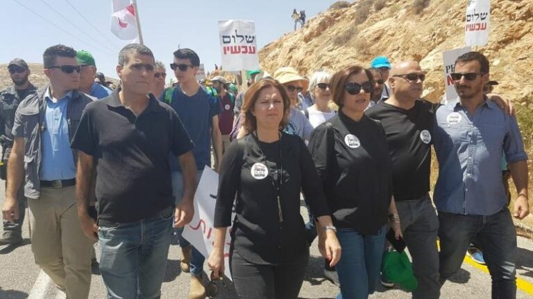 La primera línea de la marcha incluyó a los miembros de la Knesset Zehava Galon, presidenta de Meretz y símbolo de la causa pro-paz; Mijal Rozin; Essawy Frej; Mossi Raz, Sec. Gen. de Meretz Israel; y Avi Buskila, Sec. Gen. de ‘Paz Ahora’. De las presencias, se pueden advertir las ausencias de todos los factores políticos de centroizquierda.